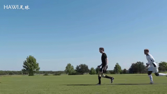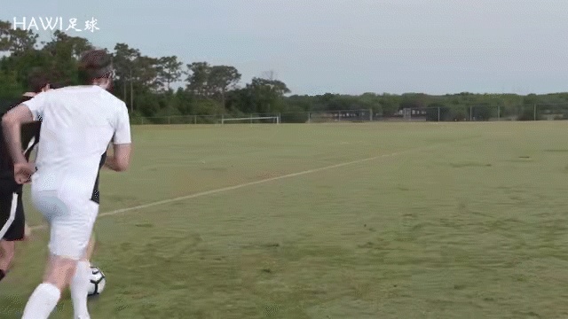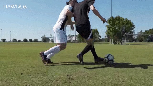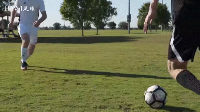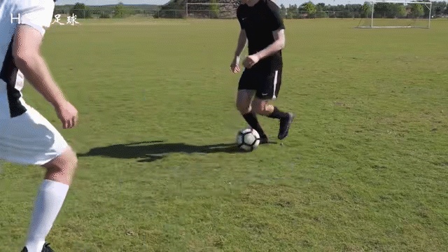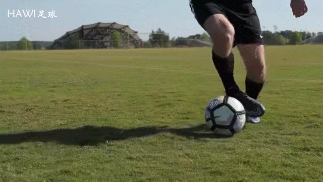 最后用同一只脚的脚背推球,同时绕过支撑腿并过掉防守球员。