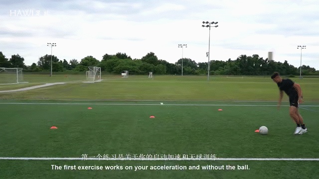 停球,转身,然后无球绕桩。所以,我们在有球和无球的情况下练习变向和加速,然后我们继续直到绕完四个角,休息30到40秒,从相反的方向重复。