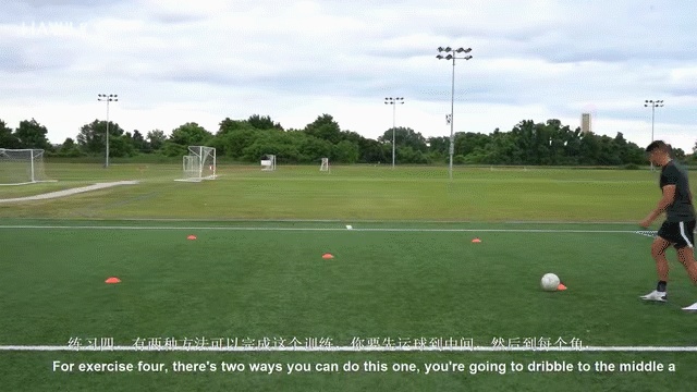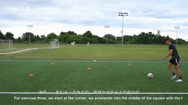 训练三,我们从一个角开始,带球加速到正方形的中间,然后停球,绕过第二个和第三个标志碟,接着我们再重复一次,绕着第四个标志碟回到起点;