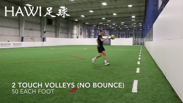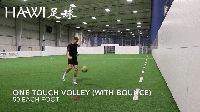 接下来我们去掉中间的球落地过程,在球弹回后一点用脚内侧或脚外侧停球,然后第二次触球将球踢回。