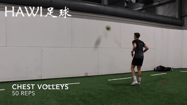 但与以上训练不同的是,用胸部停球时需要在踢墙后球的反弹有一定的高度。因为有时候比赛时因为球太高用脚无法停球,胸部停球就是一个很好的选择。