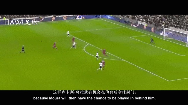另一场对热刺的比赛中,范戴克同时防守阿里和卢卡斯·莫拉,但他不能冲向阿里,这样卢卡斯·莫拉就有机会在他身后拿球射门,所以他保持低重心,然后迫使阿里向他靠近,现在艾里离禁区很近,可以看出范迪克身后的传球是行不通的;