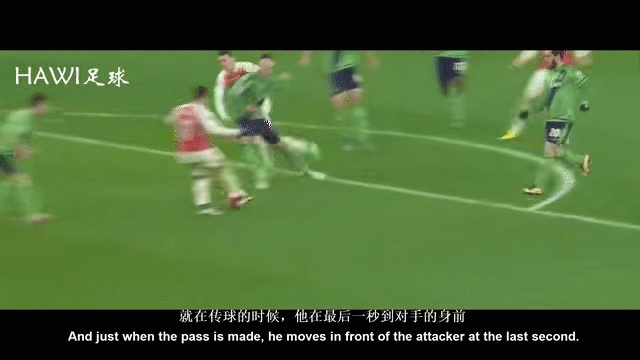 范迪克擅长的第二件事是拦截抢断,他非常擅长预判,对他来说最糟糕的结果,然后发现可能传给他前面的球员,所以他会离得很近,但通常不会和进攻球员发生身体对抗,就在传球的时候,他在最后一秒到对手的身前;