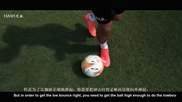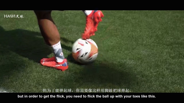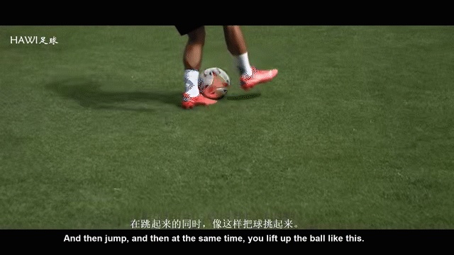 你需要把一条腿抬过另一条腿,在跳起来的同时,像这样把球挑起来。