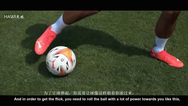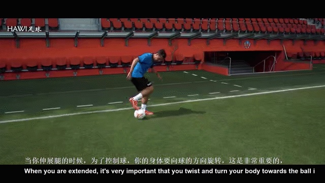 当你伸展腿的时候,为了控制球,你的身体要向球的方向旋转,这是非常重要的,也要注意,当你做这个技巧时,有一些身体部位你不想被击中。