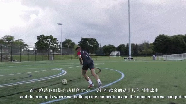 然后是最后一大步,这最后一步需要大一点,这样我的移动范围就会更大,我可以加大击球的力度,在射门中产生更大的力量。
