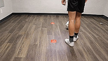 在第一个练习中,我们把球传向墙,然后用脚内侧在标志盘之间进行定向第一脚触球,这是一个非常简单的练习,但也是一个很好的热身练习,我们要轻踩脚尖,确保敏捷,这样我们就可以接住球,即使它发生了反弹或蹦跳。