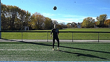 练习七,我们要做从低到高的缓冲触球,所以我们把球从手中放下,踢到头顶以上,下一次触球到头部以上,所以要控制住它,然后我们把它踢回头以上,接着我们把球接到地上,双脚交替进行。