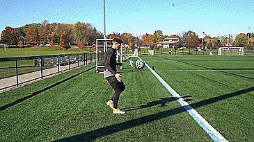 练习九是用我们的左脚踢高球,保持球在头顶以上,每一次触球都要确保我们的鞋带对着球的正中间。