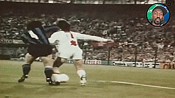 这时防守队员眼里看不见别的,他太专注于抢球了,这意味着他会失去控制,接下来我们可以看到克鲁伊夫的手臂稍微伸出了一点,这不仅是因为他要准备长传才会这么做,因为这样会给他一点空间。