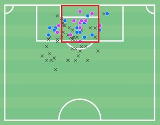 请注意,他的大多数进球(紫色)和射门(蓝色)都来自中路区域,这些区域能够优化进球机会。