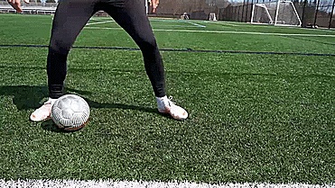 然后第二个动作是用同一只脚的外侧敲球,所以当我们越过球的时候,把我们的脚牢牢地固定在地面上,动量都来自脚底的拉球,然后我们用脚的外侧敲球,就像我们在第一个和第二个技巧中做的那样。所以我们翻转过来,把起敲回去,脚落地,接着朝相反的方向加速。