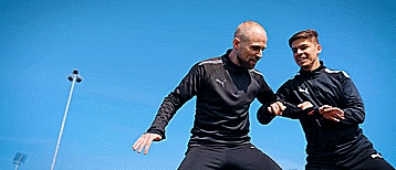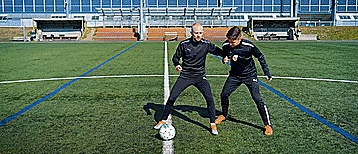 如果防守队员急切想要球,也许他会把我们推开,如果他推得太用力,我们会赢得任意球,所以把我们的身体放在对手和球之间,用身体挡球,就是这样,即使我们很瘦小。