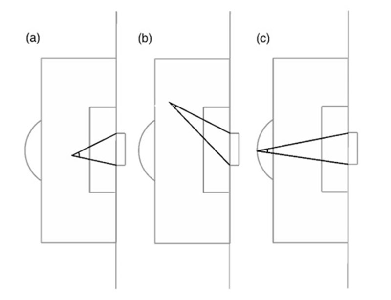 在评估射门时,首先要考虑的是球员对球门的视角:他或她看到的角度越多,射门的机会就越大。
