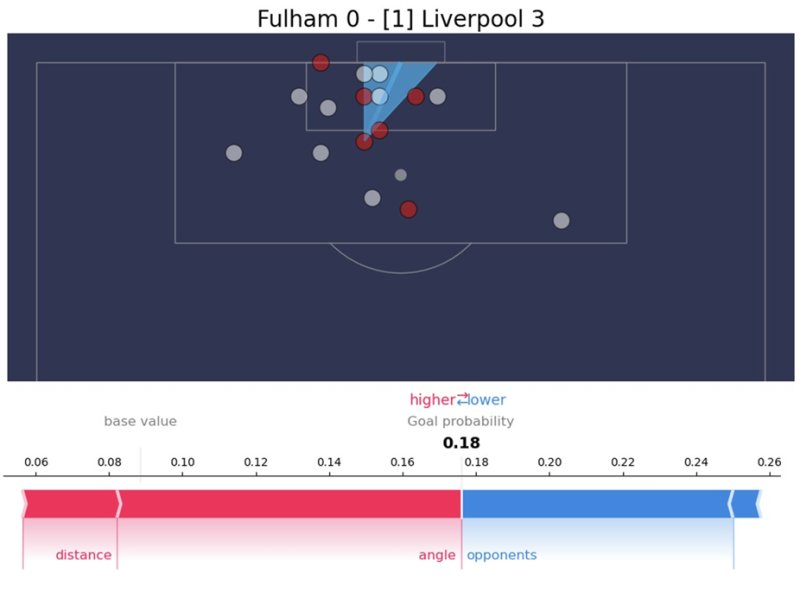 在下面的最后一个例子中,角度和距离都使射门的可能性低于平均水平,尽管射门路径上没有对手会在一定程度上增加机会。