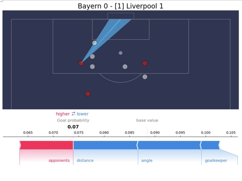 在这个例子中,距离和角度(红色)是正向的贡献。马内和球门(蓝色)之间的防守人数是负向贡献。