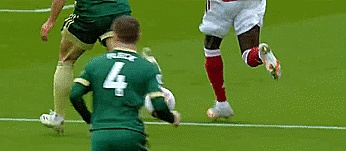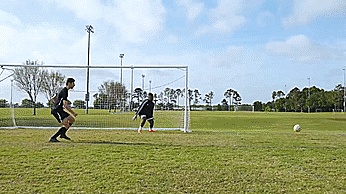 然后把球射向守门员的一侧的近门柱,将球挑过守门员张开的双臂和双腿。