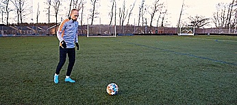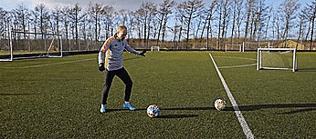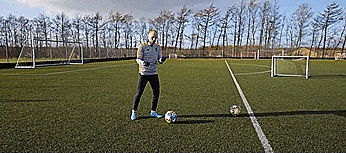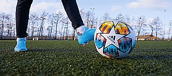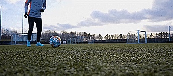 然后我们要击打球的正中间向下一点的位置,以确保能踢出回旋,直接击打中间同时也不会造成任何转向。