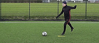 现在我们说说如何踢出转弯传球或者弧线传球,给20米后的队友,击球的角度仍然是45度,但我的脚并没有直接对着目标,大概偏离目标30度左右。