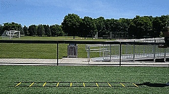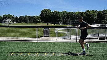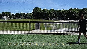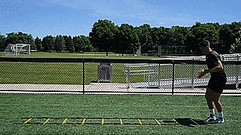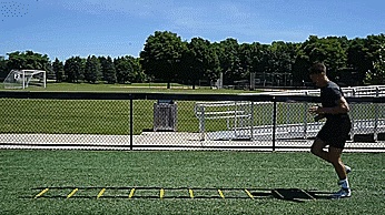 第五个练习,我们练习一些步法,在梯子的前两格,我们双脚交替进入,然后我们用前脚跳梯子的下两格。