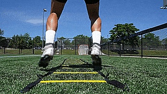 需要一点协调性,我们要转动臀部和保持脚尖轻盈,所以我们从前面走,然后从侧面走,接着从后面沿着梯子的每一个方格交替前进。