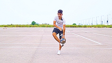 第三步,我们将球放在脚踝上,然后用弱势脚从这个空隙跳过去,我们就像下面这样用手抓住球,然后从这个空隙跳过去。