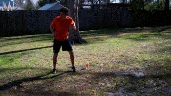 接到球以后,突然向右转向,同时用惯用脚的外脚背将球向右后方拨。
