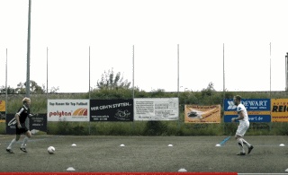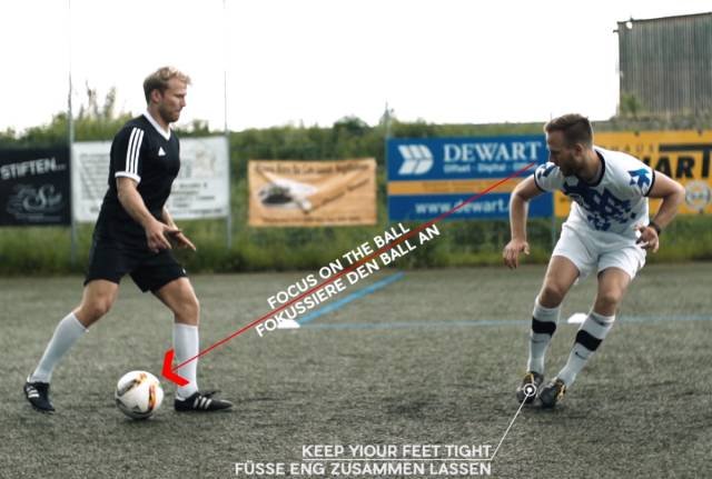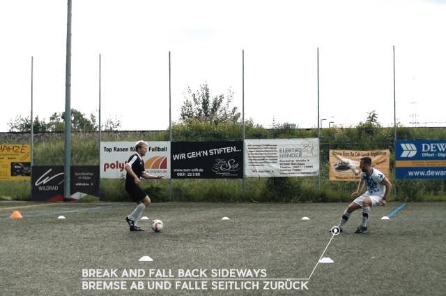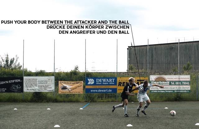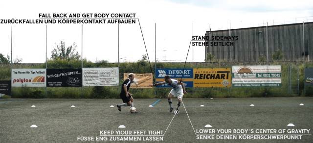 而如果此时没有其他队员协助, 那么尽可能不要抢球, 而是侧身与对方保持距离并侧面对着对方后撤, 为门将调整准备时间,同时也能预防对方过掉自己后,能够快速转身追赶。