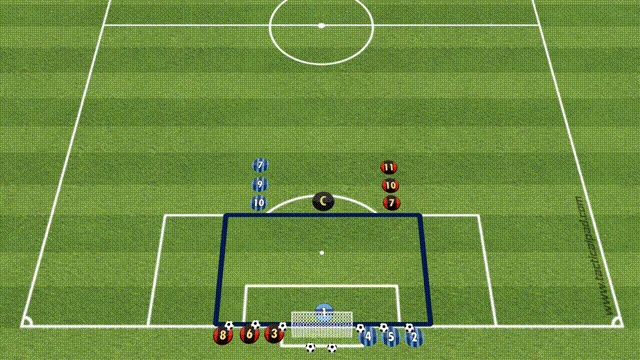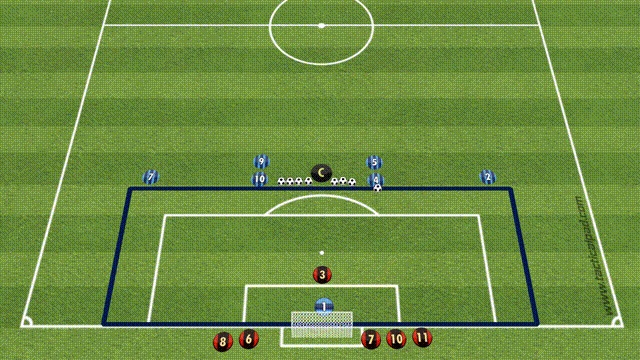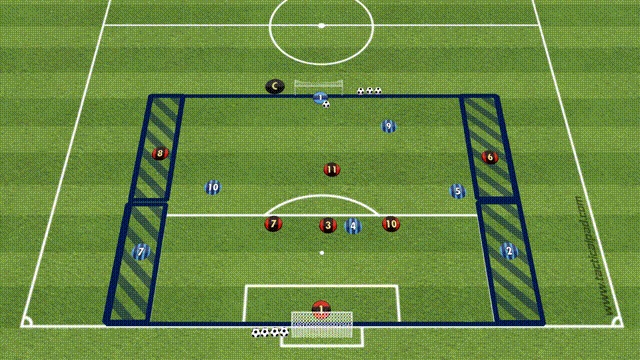 2: 标志盘内4名球员站在进攻范围内接球传中,传中队员与场上队员五分钟轮换;