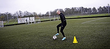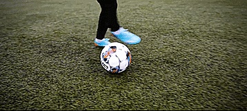 当我们的脚踩到地面的时候,我们要用另一只脚向相反的方向轻触球,打向防守者的弱势脚,让我们有一瞬间的时间摆脱。