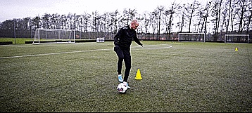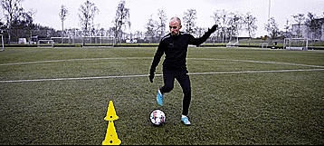 第二招就是经典的马修斯假动作。这是一个超级简单但也超级有效的变向技巧,用我们惯用脚的脚内侧向前带几步,让对手相信我们要朝着一个方向前进。