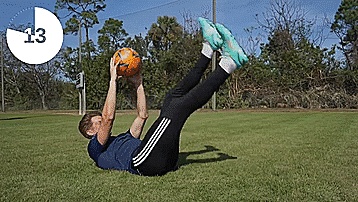 然后双手持球,从地面举起来,最后和脚尖接触。