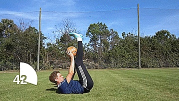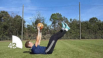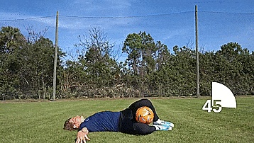 接下来我们把球夹在我们的膝盖中间,双臂张开,然后将膝盖从一边摆动到另一边。