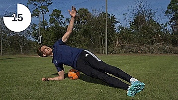 下面一个动作,我们要做侧身平板支撑,我们用右脚外侧和右前臂支撑身体,然后将左臂举向天空,然后将左臂收回身下触球,接下来重复这个动作。