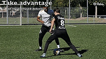 然后把你的脚外侧放在球下面,抬起膝盖,把球挑过对手的腿,现在用另一只脚用力蹬地,加速进入空间。