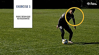 第一个练习是掌握基本的技巧,从沉肩开始,练习让我们的脚外侧在球下面,做出一个完美的挑球