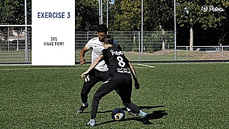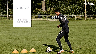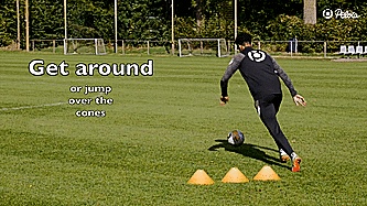 用标志盘模拟对抗练习把握时机,掌握好沉肩的时机,并确保我们把球切过标志盘,通过绕过标志盘或跳过标志盘来练习避免防守队员的铲球。