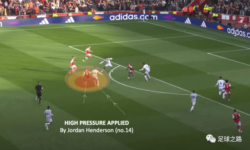 在这种情况下,亨德森的移动被认为是一种高强度的压迫,因为他积极努力地逼近球员并且他靠近红色高压区。