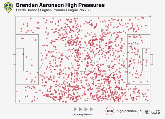 在截至5月份的2022-23赛季的欧洲五大联赛中,我们发现利兹联的阿伦森在场上施加的高强度压迫最大(场均48.1次)。