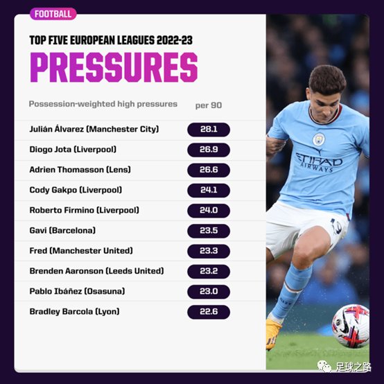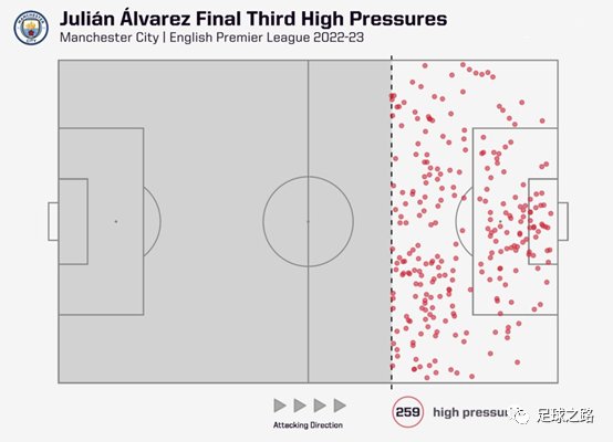 在欧洲五大联赛中,阿尔瓦雷斯也是本赛季在前场区域应用高强度压迫最多的球员(场均23.6次),通过了瓜迪奥拉为曼城在前场抢回球权的眼光测试。