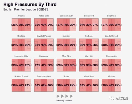 在高压战术的另一端是诺丁汉森林,他们更喜欢守在后面,只在前场施加了22%的高压。