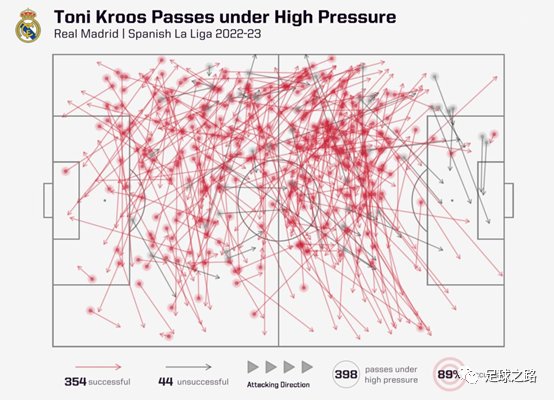 这位四届欧冠得主在高压下的传球成功率在欧洲五大联赛中最高,在高压下尝试的398次传球中完成了354次,达到89%。