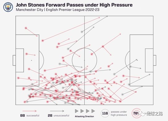 他在高压下近三分之一的传球是向前传的,其中76%成功找到了队友。
