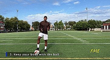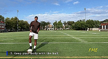我们要把脚的中部放在球的中部,和脚底后拉一样,现在重要的是,当我们把球拉过身体时,我们要和球保持在一起,所以我们不希望球在我们前面太远,也不希望球在我们后面太远。