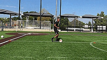 当我们到达另一个标志盘体时,踩住球的中间,将球向反方向拉回,确保我们带球转身,并用另一只脚进行下一次触球。