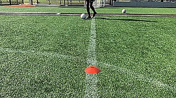 在第三项训练中,我们将练习拉球转身,与上一项训练一样,我们将把两个标志盘体或标记物放在相距10到15步的地方。